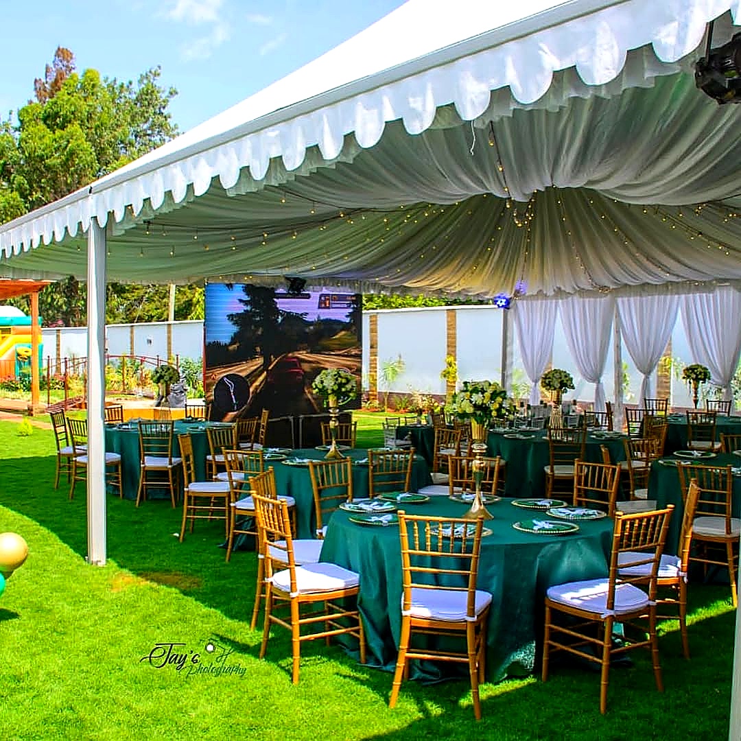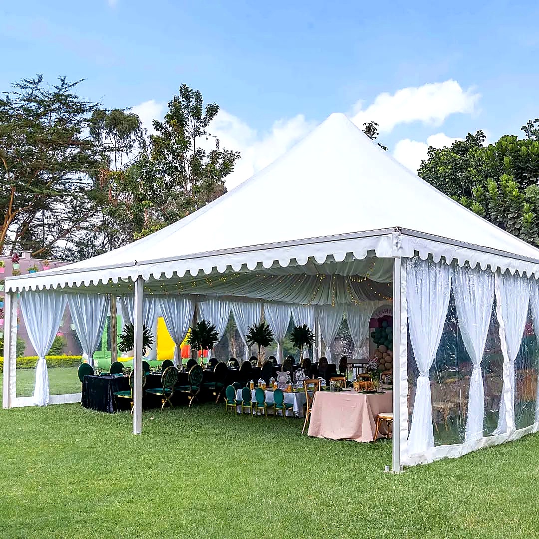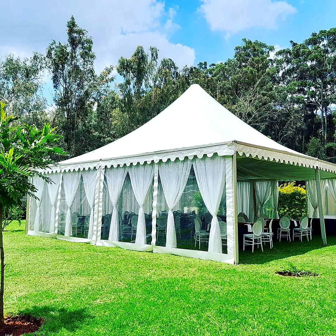 The B Line Pagoda Tent 10x10m bridges the gap between our 6x6m and 12x12m models. This 33ft x 33ft tent features the same refined aluminium frame engineering with polished joints, offering generous space for medium to large events. Seats up to 80 guests with armless chairs or 5 tables with 50 chairs. The multi-peaked roof design creates an impressive silhouette, making it ideal for wedding receptions, corporate functions, and milestone celebrations across Nairobi.