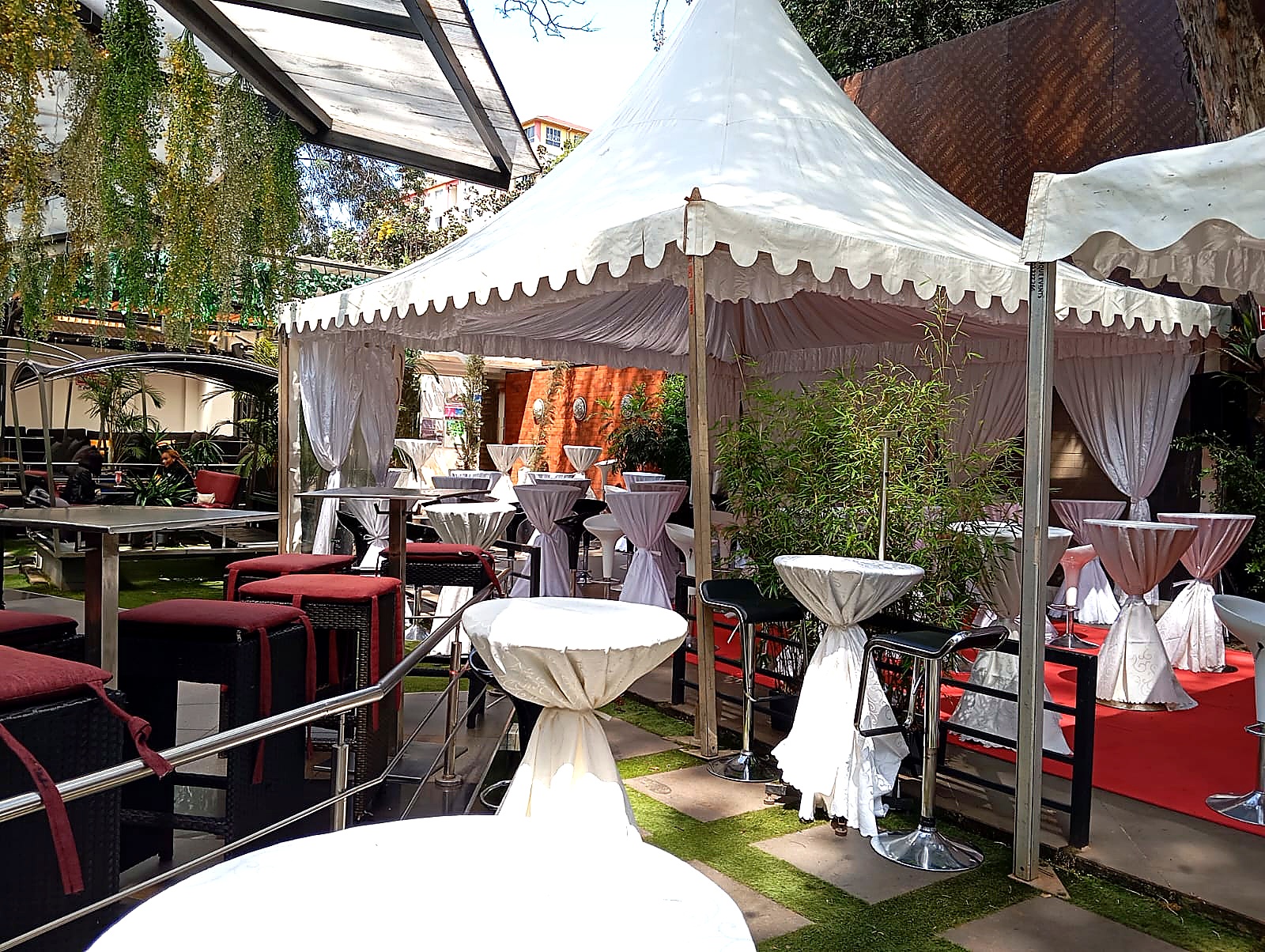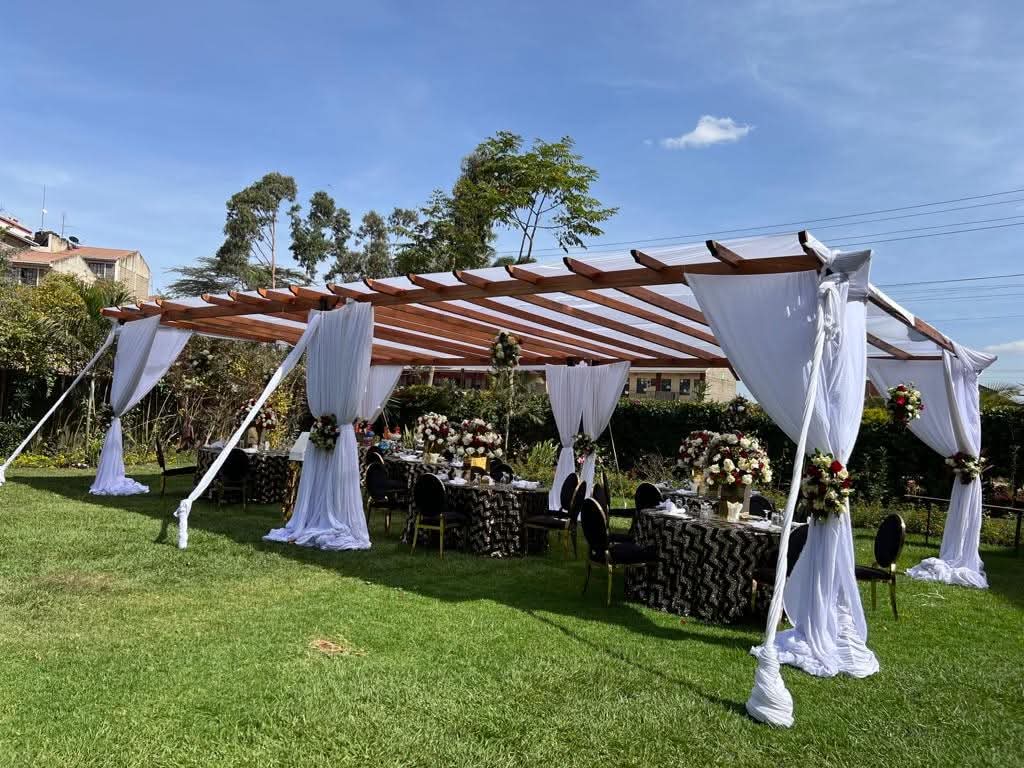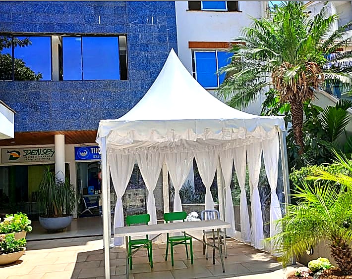 The B Line Pagoda Tent 3x3m is the compact version of our premium B Line range. Featuring the same refined aluminium frame engineering and polished joints as its larger counterparts, this 10ft x 10ft tent is perfect for intimate VIP areas, registration points, cocktail corners and small garden events. Seats up to 10 guests with armless chairs or 1 table with 8 chairs. A popular choice for exclusive setups and accent tents at larger events across Nairobi.