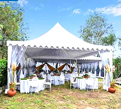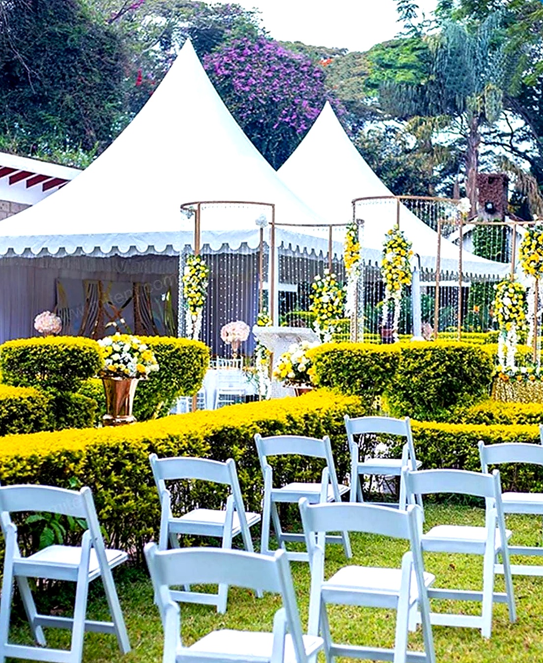 The B Line Pagoda Tent represents the top tier of our pagoda range. Featuring refined frame engineering with polished aluminium joints, this 19ft x 19ft tent offers superior stability and a pristine aesthetic. Seats up to 50 guests with armless chairs or 3 tables with 30 chairs. A favourite for high-end wedding receptions and corporate galas across Nairobi.