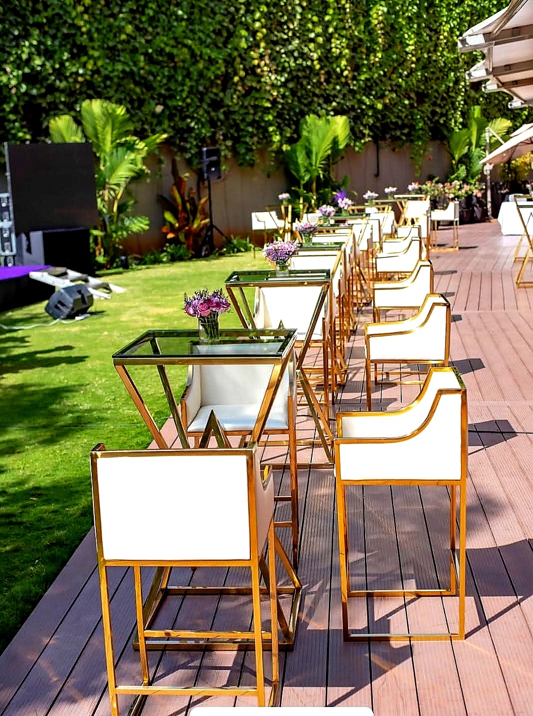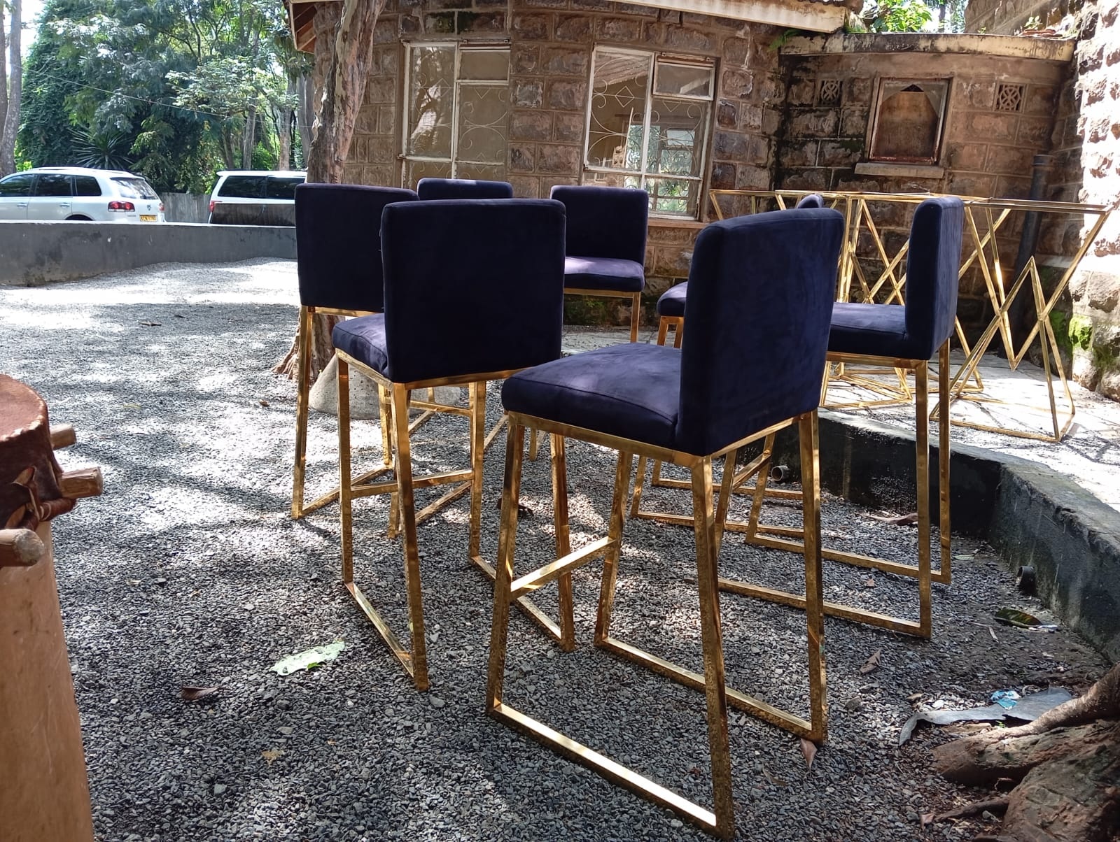 Our Elegant Bar Tables feature a striking gold-finished geometric metal frame with a glass top surface. These premium cocktail-height tables bring sophistication to any bar area or VIP lounge. The modern design and luxurious finish make them the centrepiece of upscale cocktail parties, corporate events and wedding receptions across Nairobi. Pair with our Elegant Bar Stools for a complete luxury bar experience.