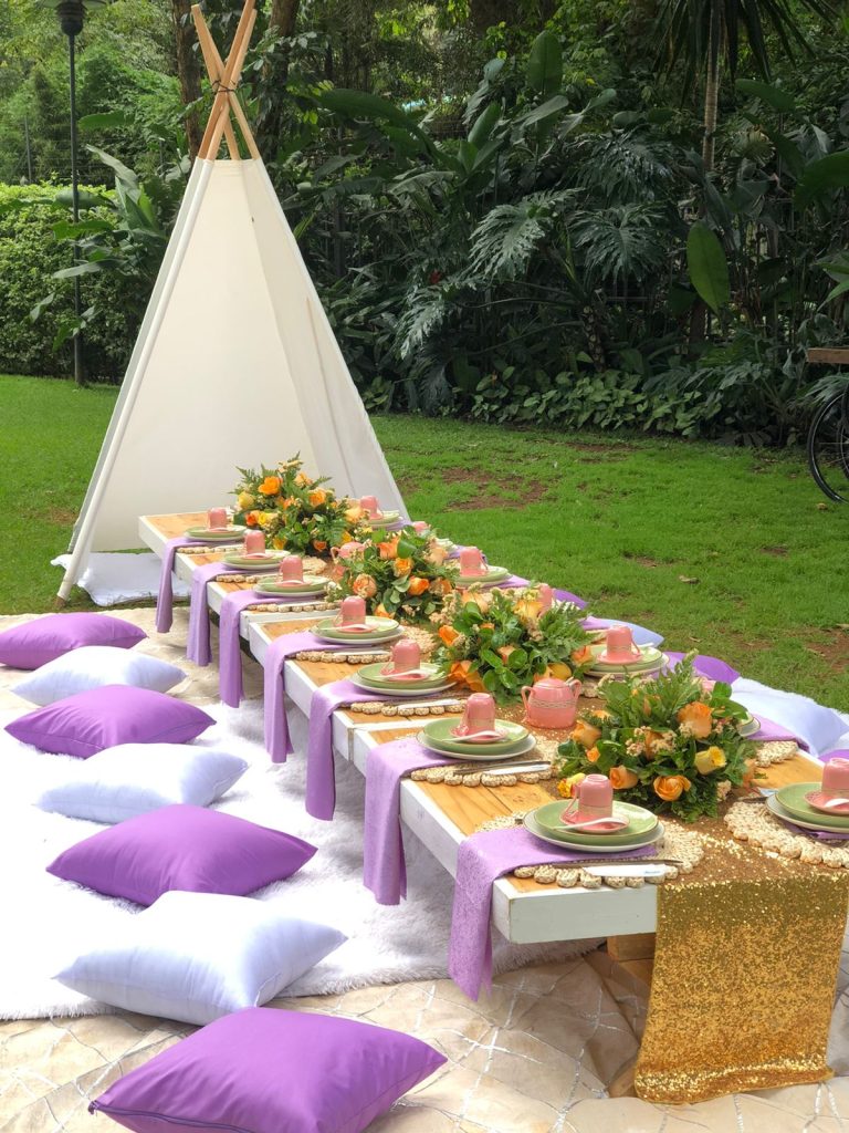 The Adventure Anchor takes outdoor picnicking to new heights for 25 guests. This premium-tier package delivers an expansive boho experience with a large professional shaded tent, layered boho mats, and 25 plush picnic pillows for luxurious floor seating across a generous footprint. The beautifully dressed long table features lavish fresh flower centerpieces, 25 elegant table mats, and signature place settings with charger plates, premium cutlery, and satin napkins with elegant rings. 25 premium goblets and personalized branded water bottles ensure every detail is Instagram-worthy. The star of this package is the upgraded Towering Luxe Balloon Backdrop — a dramatic, larger-than-life installation that transforms the entire picnic into an unforgettable celebration. The Elite Canvas Teepee Suite adds the perfect bohemian finishing touch.