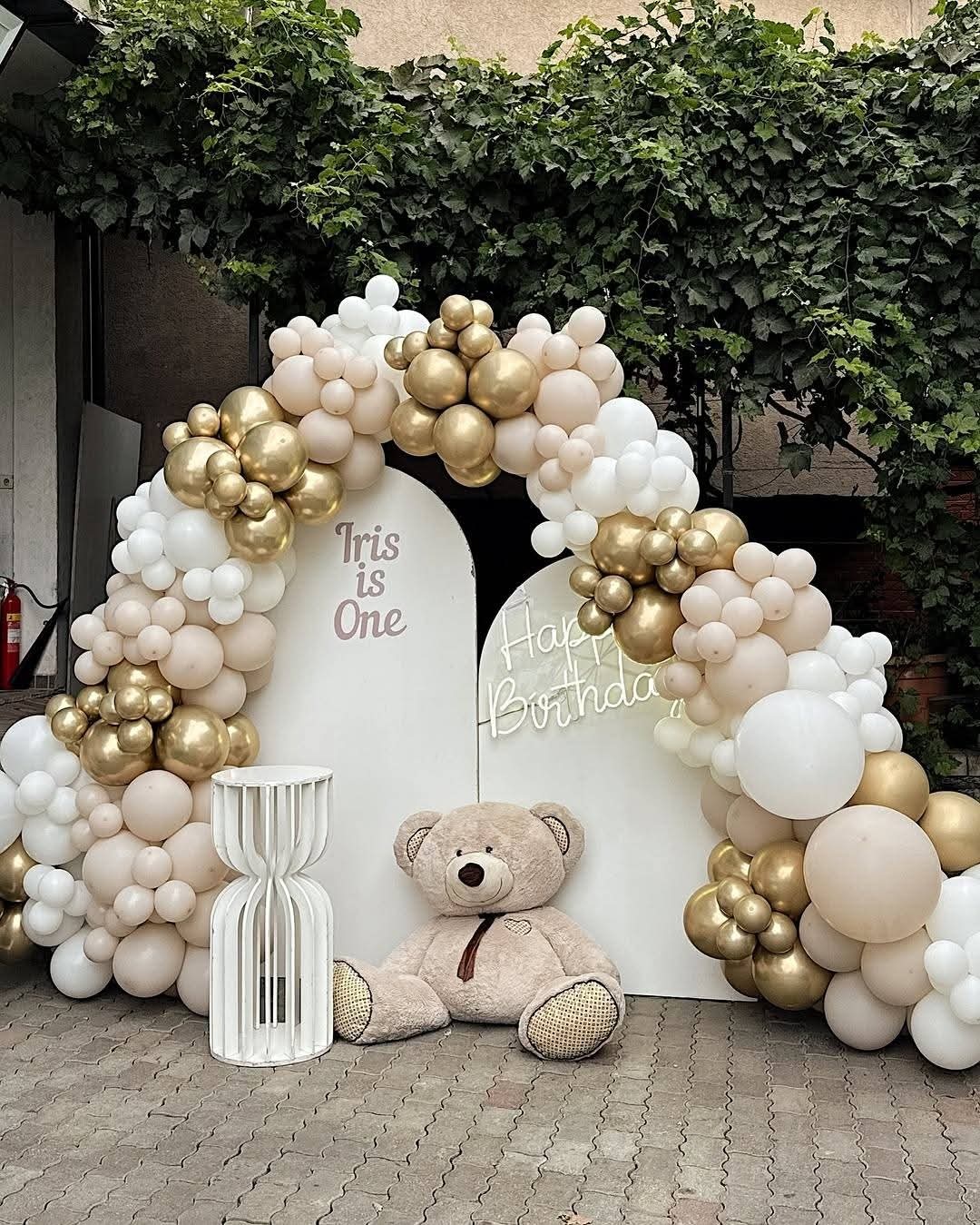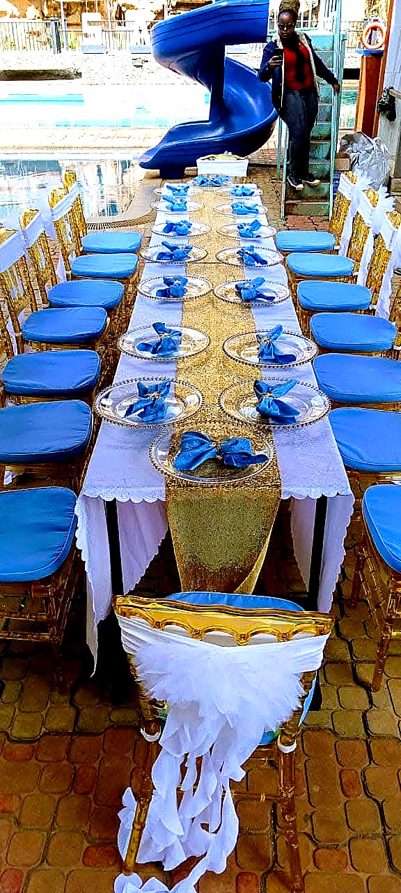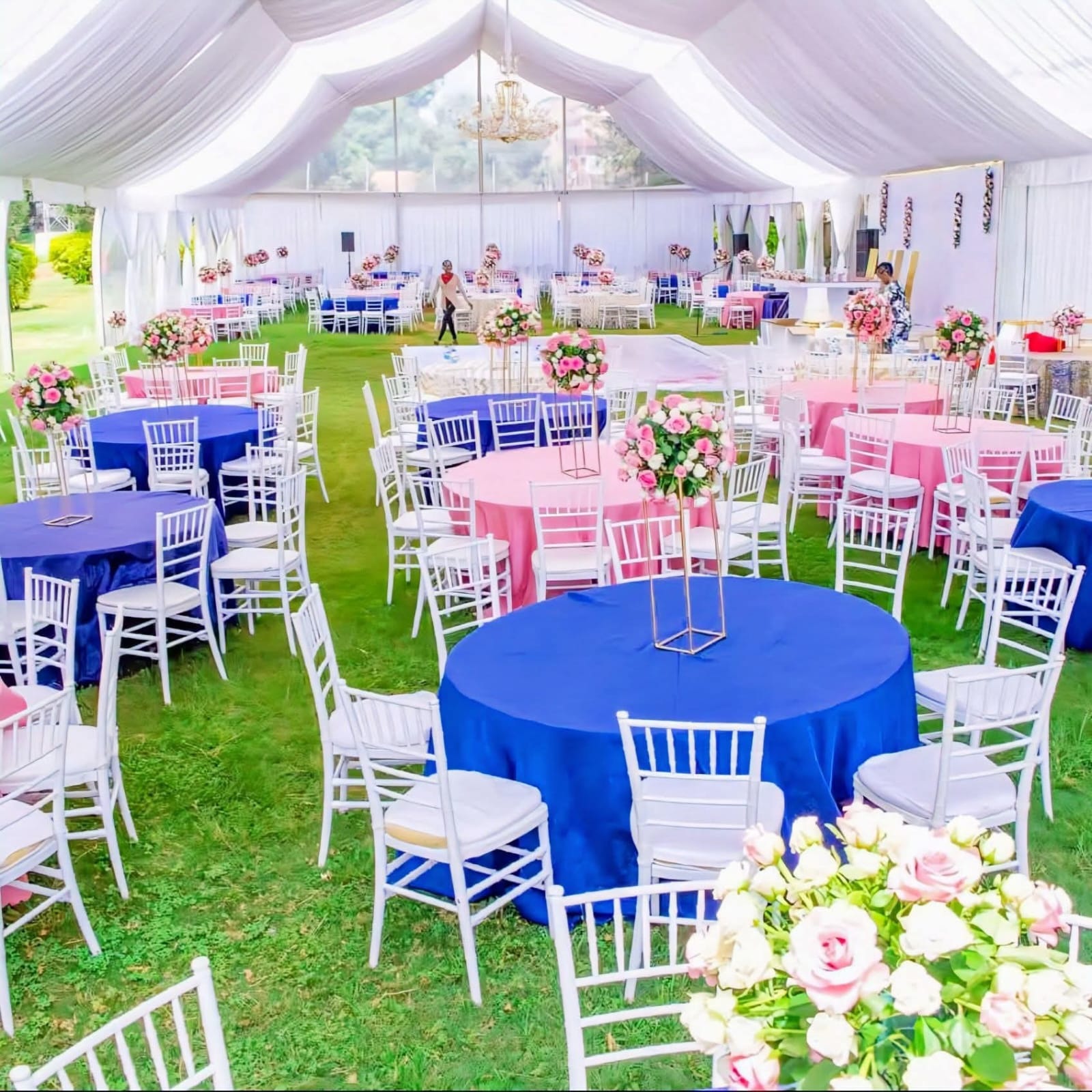 The Essential Celebration for 70 guests introduces the stunning Grand Pavilion Triple Door Backdrop, perfect for larger celebrations. This package includes all standard elements plus elegant glass goblets, the Grand Pavilion Triple Door Backdrop, decorated cake table, and 2 styled food tables. Transport is charged separately.