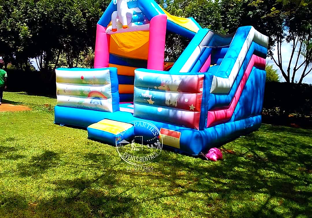 Gallop into a magical world with our Unicorn Bounce Bouncing Castle! This enchanting combo unit features pastel rainbow colours, unicorn graphics, and a sparkling design that children adore. Includes a spacious bouncy play area connected to a fun dry slide. The 6m x 6m footprint is perfect for garden parties and school events across Nairobi. Child minder included for safe play.